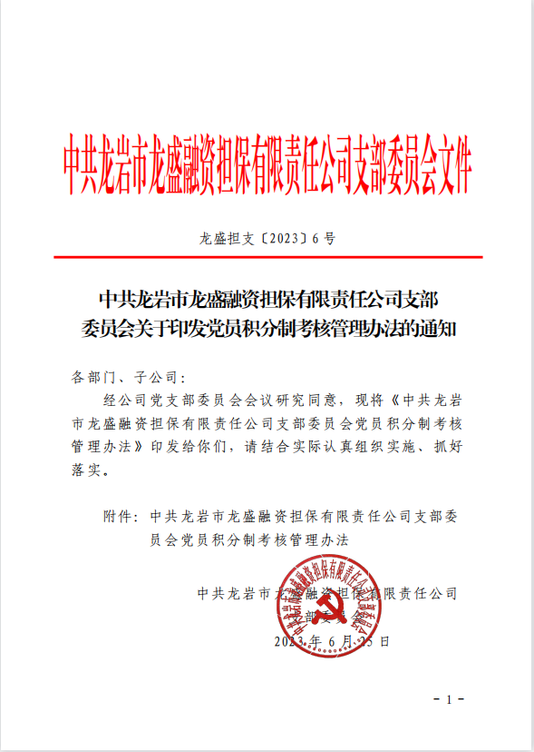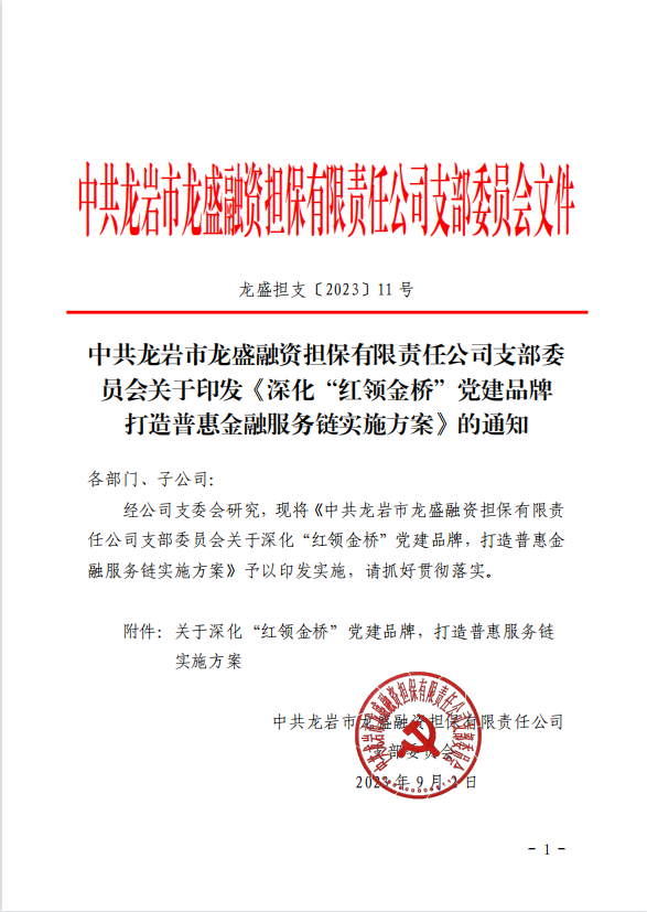 近年來,龍盛擔保公司黨支部以習近平新時代中國特色社會主義思想為指導,以“四抓手”持續深化“紅領金橋”黨建品牌建設,助推黨建與業務相融并促,匯聚起服務實體經濟發展的強大合力。公司黨支部先后被集團黨委、市國資委黨委評為“先進基層黨組織”,公司連續兩年被市委、市政府評為“服務實體經濟十佳金融機構”,今年獲省屬企業投資入股5000萬元,成功引入國家融資擔保基金落地龍巖。