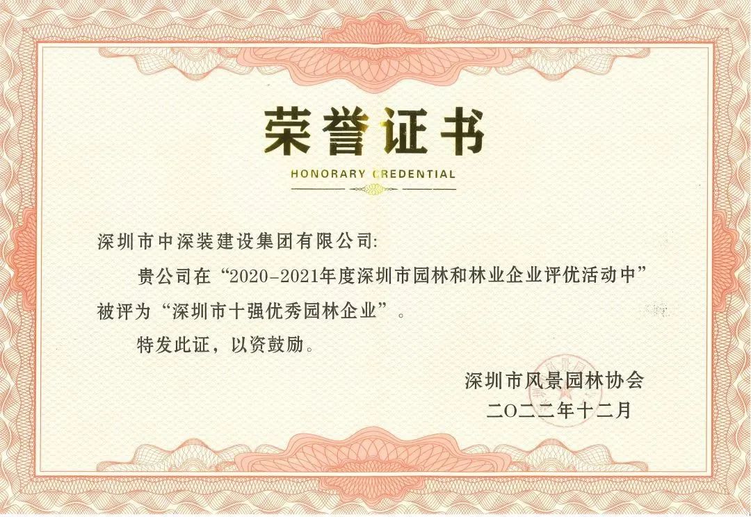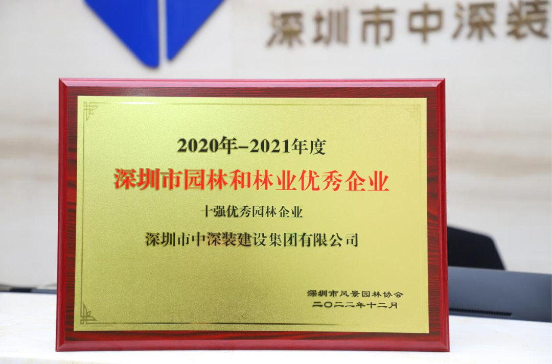 近日,中深裝集團收到深圳市風(fēng)景園林協(xié)會頒發(fā)的“2020-2021年度深圳市園林和林業(yè)優(yōu)秀企業(yè)”榮譽證書和牌匾,按照評選規(guī)則,評優(yōu)總分位列前10名被授予“深圳市十強優(yōu)秀園林企業(yè)”稱號,中深裝集團位列其中,此次獲獎,也是中深裝集團繼2010年獲評該稱號以來連續(xù)十一年獲此殊榮。