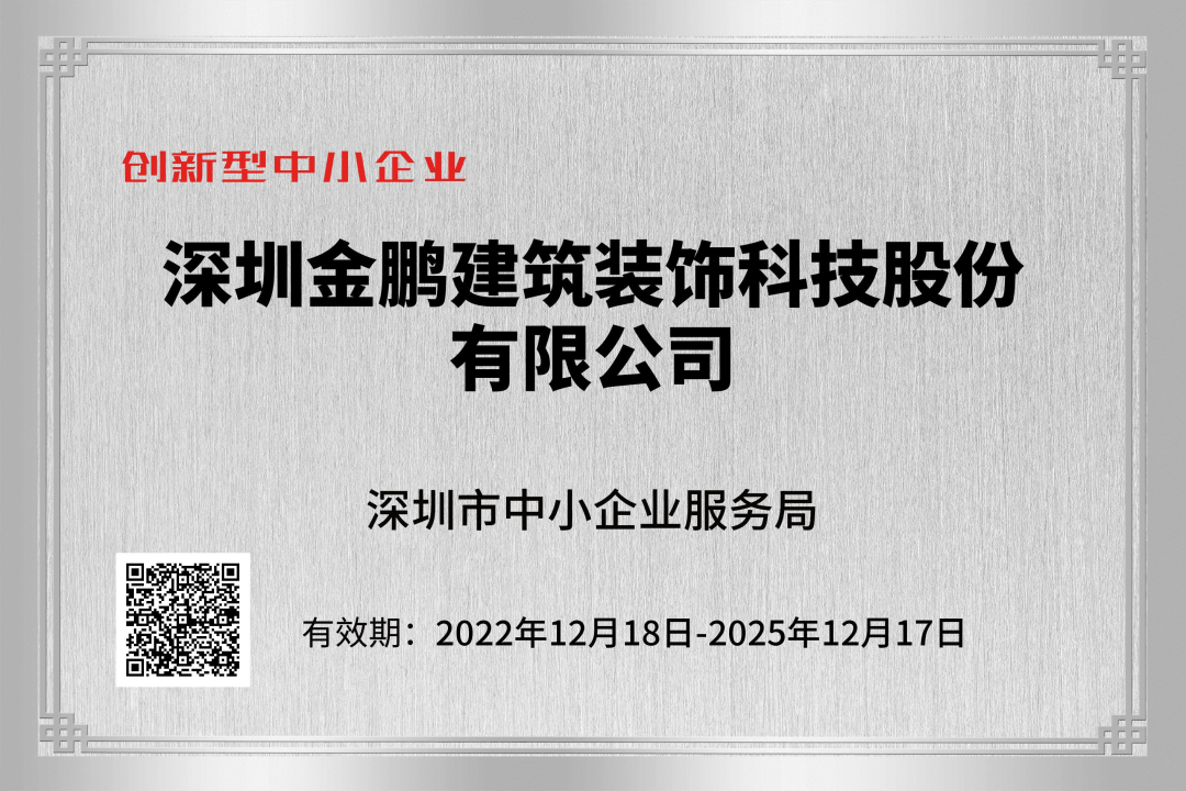 近日,深圳市中小企業服務局公布了關于2022年深圳市“專精特新”及“創新型”中小企業名單,經過申報、初審、復核等嚴格程序的評審,優先遴選專業化、精細化、特色化、新穎化特征明顯、創新能力強、質量效益好的企業。在此次認定中,深圳金鵬建筑裝飾科技股份有限公司憑借創新先進的施工工藝、精細化的施工管理以及高質量的項目服務,獲得深圳市“專精特新”與“創新型”企業認定。這是金鵬建筑裝飾多年來穩健高質量發展的成果,也是政府對企業創新能力、行業影響力及綜合實力的高度認可。