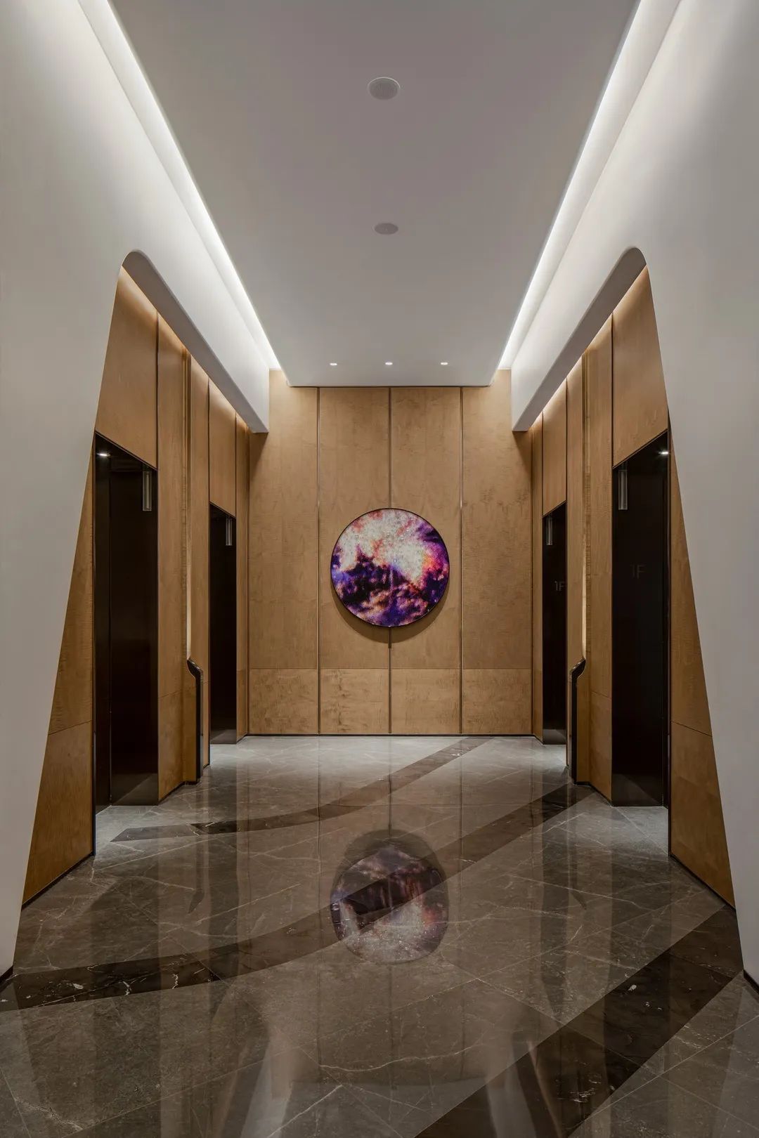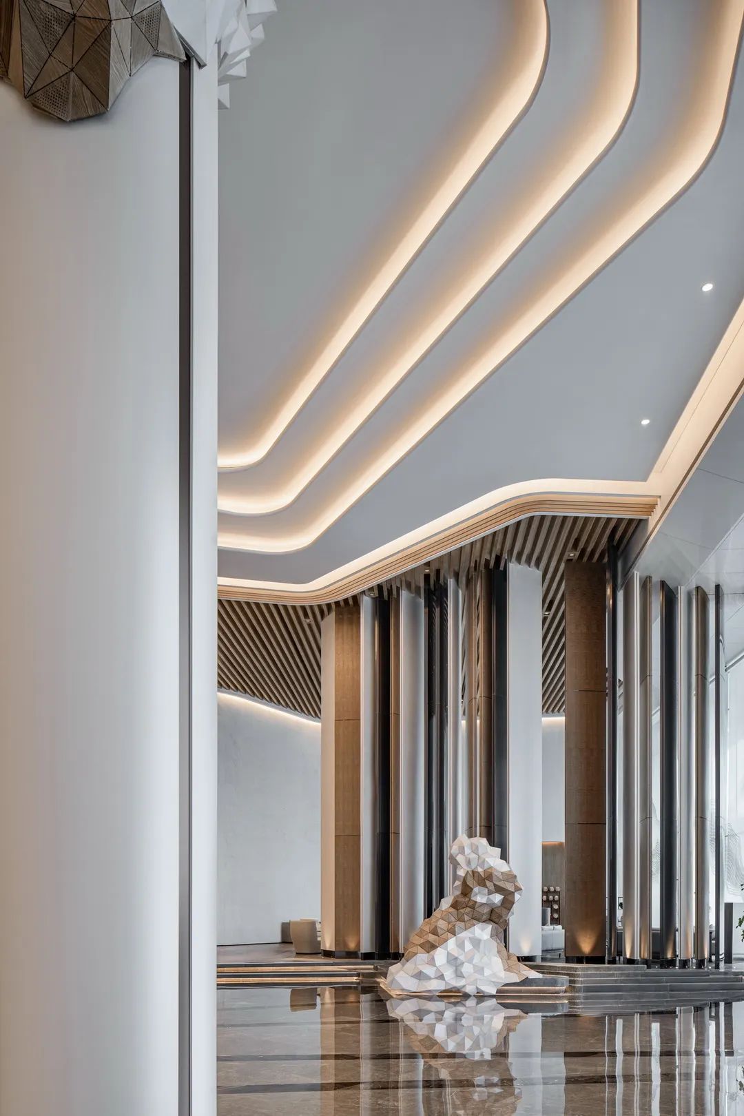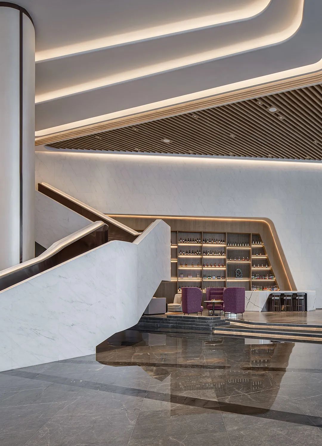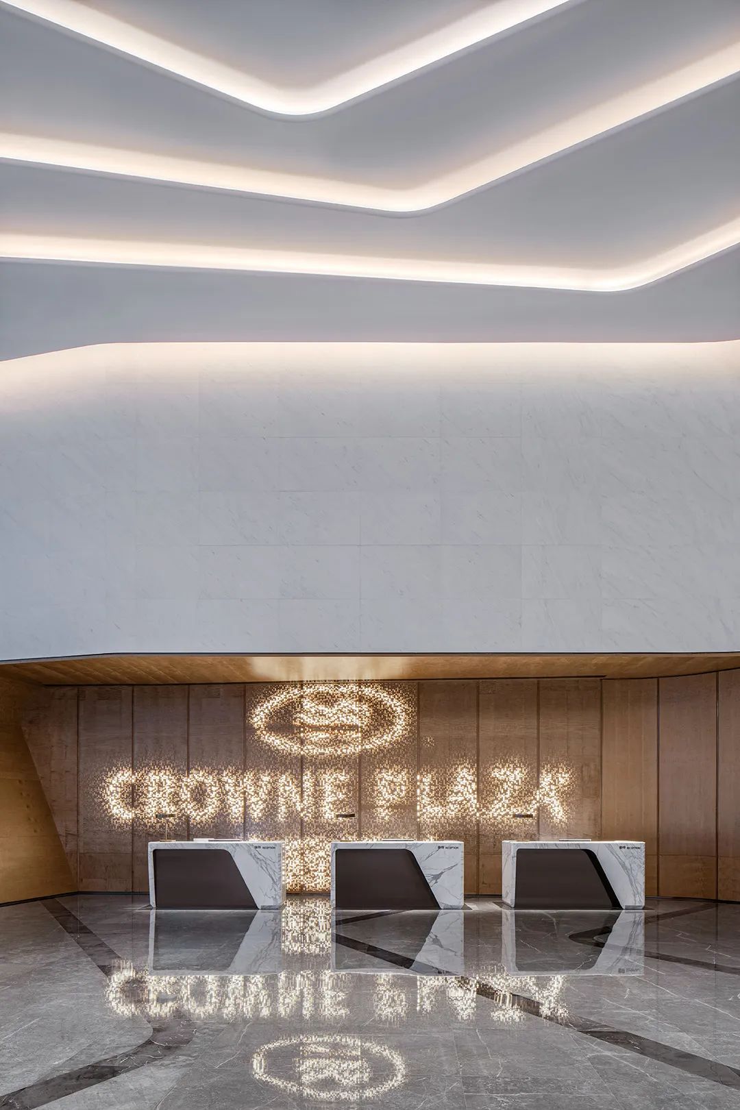 凝視是一種無意識的觸摸。與皇冠假日酒店的第一次對視,你會讀取到清晰的輪廓、升騰的秩序和流暢的線面結構。進入大堂,均質的釉白從穹頂蔓延,蕩出層層硬朗漣漪,向下勻速流動,圍合成弧形墻體,曲面廊梯。