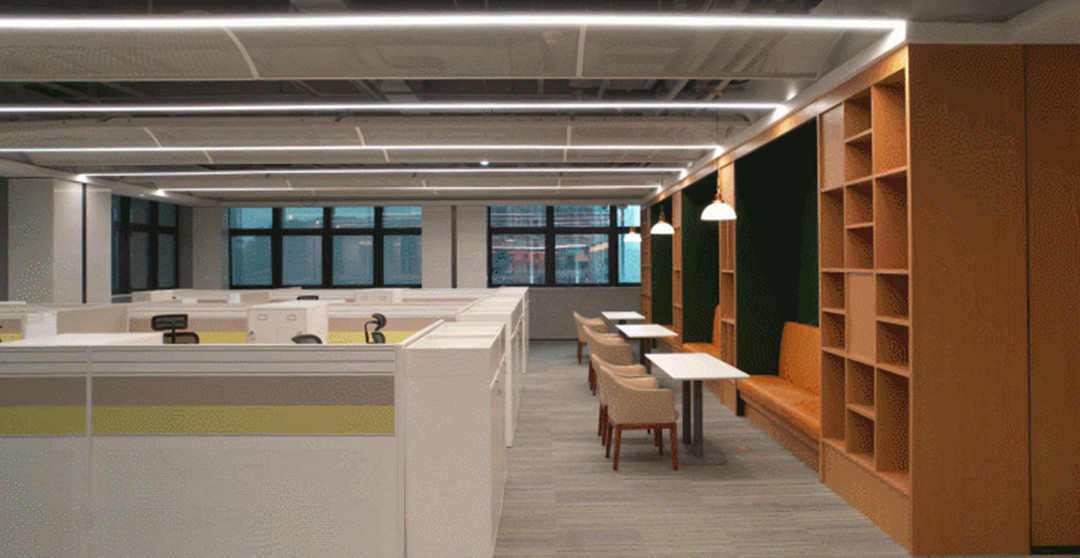 開放辦公區(qū)則選擇天花弧形鋁板吊頂,嵌以長條線燈,使整個(gè)空間更有未來感、科技感;墻面以人造石柱裝飾,生發(fā)出光潔靈動(dòng)的質(zhì)感。辦公區(qū)整側(cè)臨窗,通風(fēng)透氣、采光十足;為兼顧舒適性與功能性,項(xiàng)目管理團(tuán)隊(duì)推敲每一寸空間用途及材質(zhì)搭配的合理性,將空間的潛能開發(fā)到極致。
