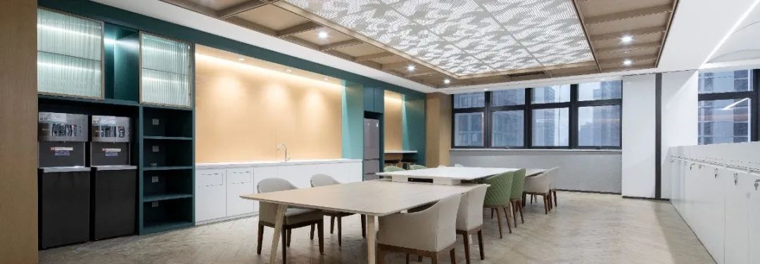 休息區(qū)、茶水間的整體視覺由大色塊拼合而成,莫蘭迪色系墻面過渡自然,呈現(xiàn)大氣而純粹的精致美感;地面木紋磚則采用人字型鋪貼,錯(cuò)落有致的排列讓木地板更加靈巧生動(dòng),使空間更富延展性。