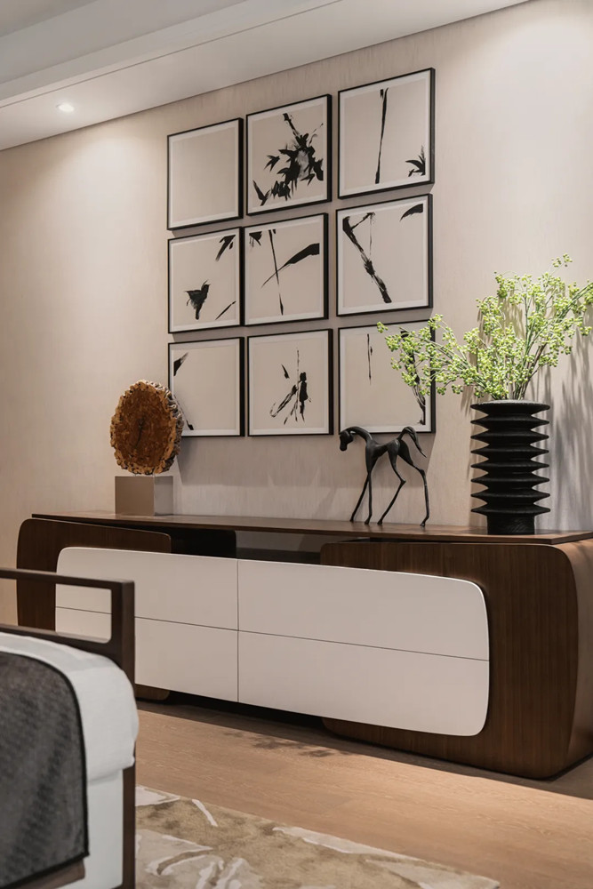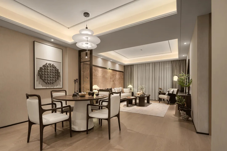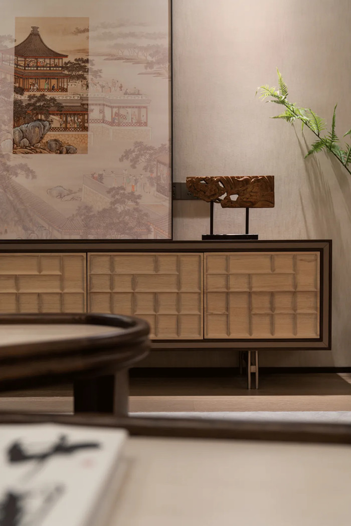 一體式的設(shè)計(jì)令空間顯得大氣而舒展,客廳是家的社交地點(diǎn),也是景之所在??臻g以南京意境為主題,追敘過(guò)往時(shí)光。