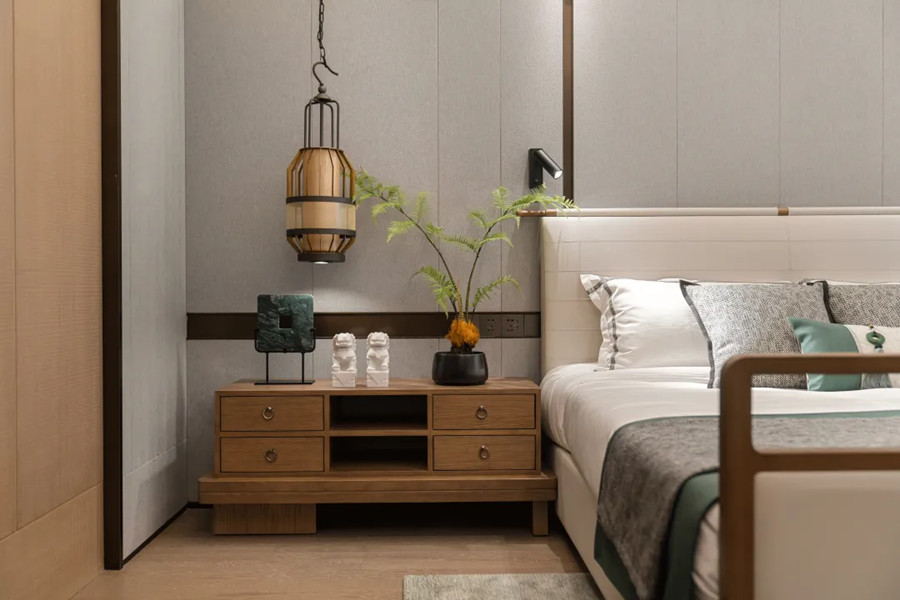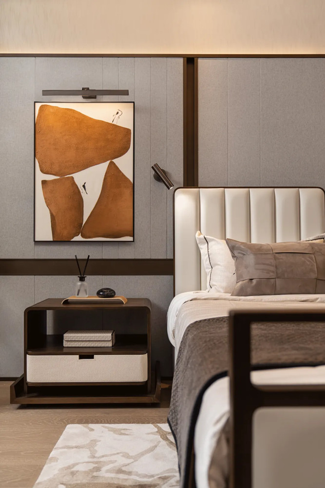老人的睡眠空間傳承了從建筑中來(lái)的中式留白意境,雅致沉穩(wěn)的棕調(diào)構(gòu)建出具有東方氣質(zhì)的禪意之所,適度留白傳遞長(zhǎng)者淡雅從容的生活品味,在飽滿的間距式照明光影的交織中,勾畫(huà)出一間具有多重維度體驗(yàn)的就寢空間。