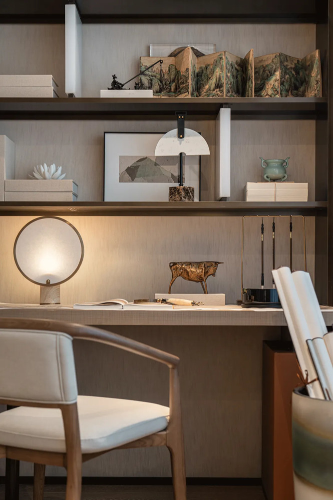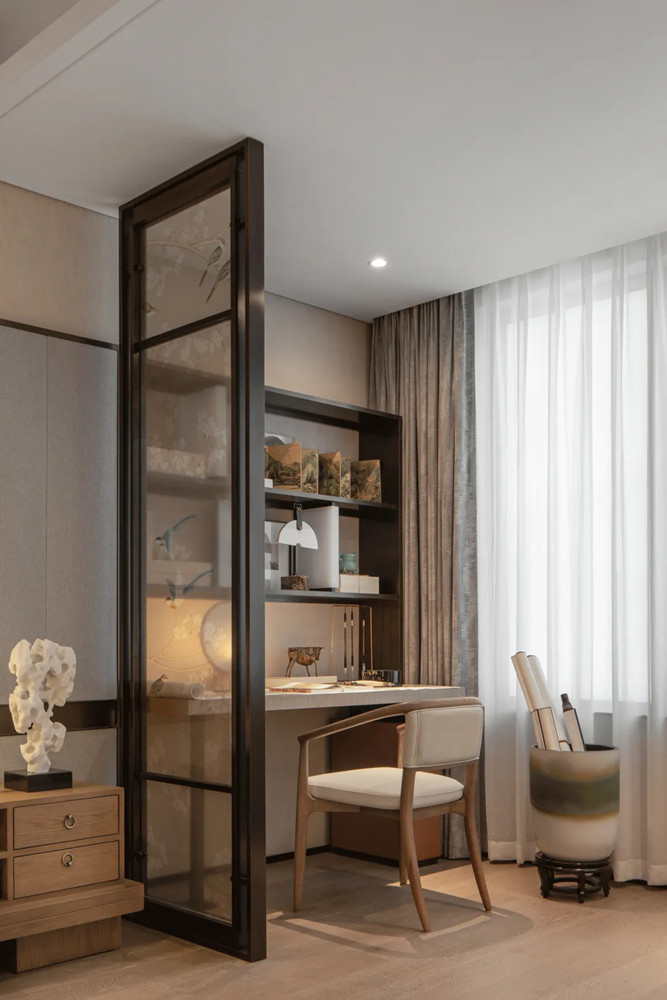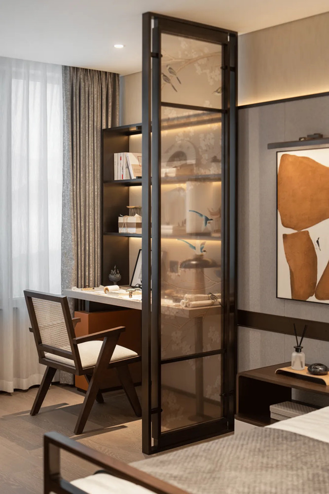 書(shū)桌用朦朧屏風(fēng)隔開(kāi),營(yíng)造一種隔而不斷的別質(zhì)感,增添空間層次與意境,墻面擺件是長(zhǎng)者晚年興趣愛(ài)好的呈現(xiàn),局部點(diǎn)綴靚麗橙色,既為空間注入活力,又保障了老人視覺(jué)的舒適度。