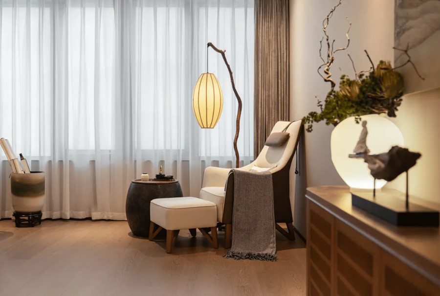 自然變老是尊重自然規(guī)律的一種形式,也是歲月沈淀后一種灑脫從容生活態(tài)度,在空間的設(shè)計(jì)中,設(shè)計(jì)師借勢(shì)自然打破人與自然的界限,用更為柔和舒緩的色調(diào)敘事,詮釋長(zhǎng)者歷盡浮華之后精神的從容與平和,軟裝陳設(shè)取當(dāng)?shù)貍鹘y(tǒng)文化及山水形態(tài)塑造情境,純粹本真的質(zhì)感材料勾勒質(zhì)量格調(diào),共同營(yíng)造出充盈悠然的老年生活。