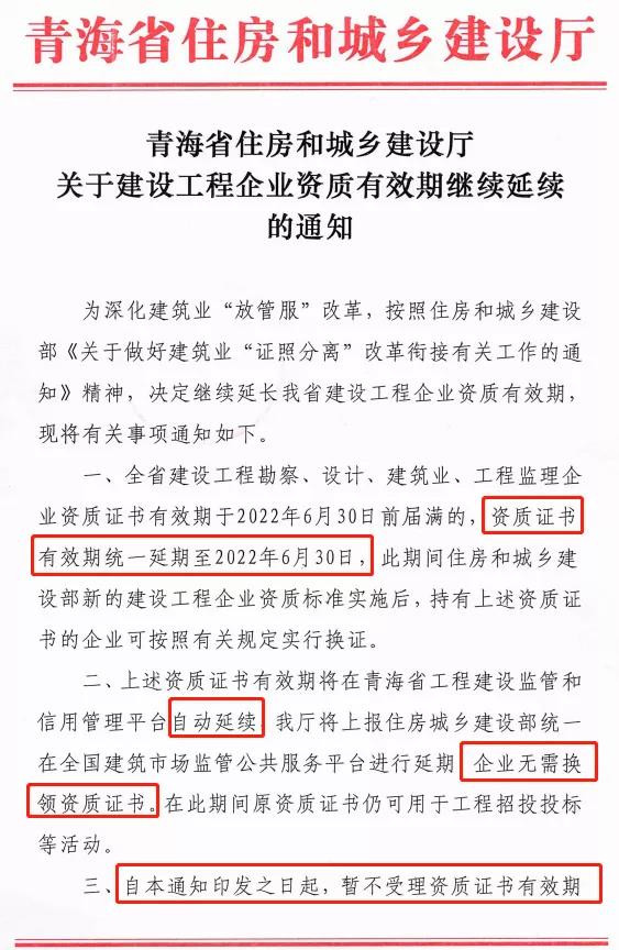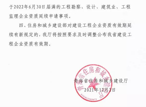 12月3日,內蒙古自治區住房和城鄉建設廳發布通知:按照我廳《關于建設工程企業資質延續有關事項的通知》(內建行〔2020〕130號)規定,我廳核發的工程勘察、工程設計、建筑業、工程監理企業資質有效期延期至2021年12月31日的,以及企業資質證書有效期于2022年1月1日至6月29日期間屆滿的,資質證書有效期繼續延期至2022年6月30日。