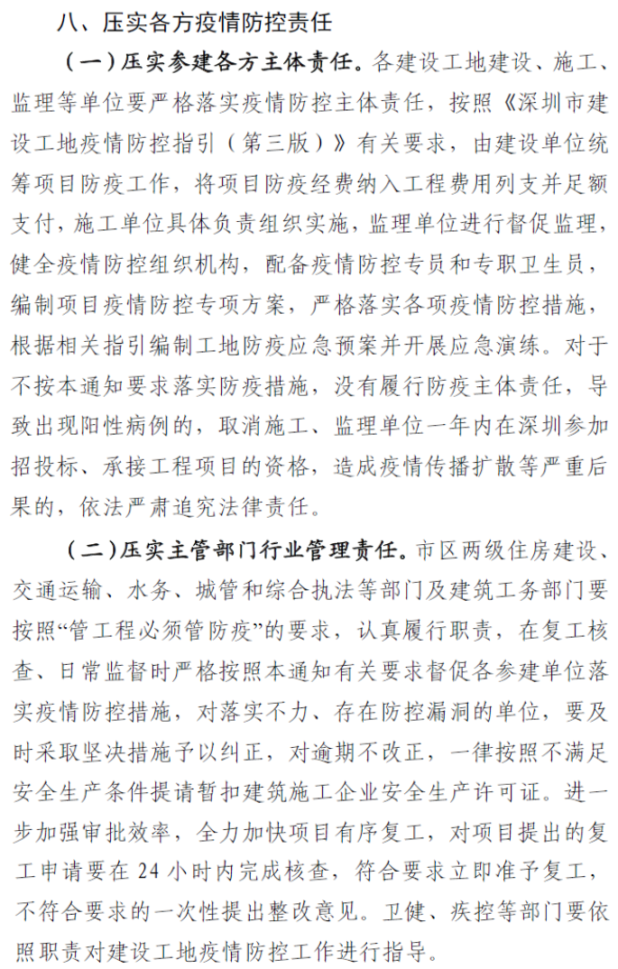 2.對于不按本通知要求落實防疫措施,導致出現陽性病例的,取消施工、監理單位一年內在深圳參加招投標、承接工程項目的資格,造成疫情傳播擴散等嚴重后果的,依法嚴肅追究法律責任。