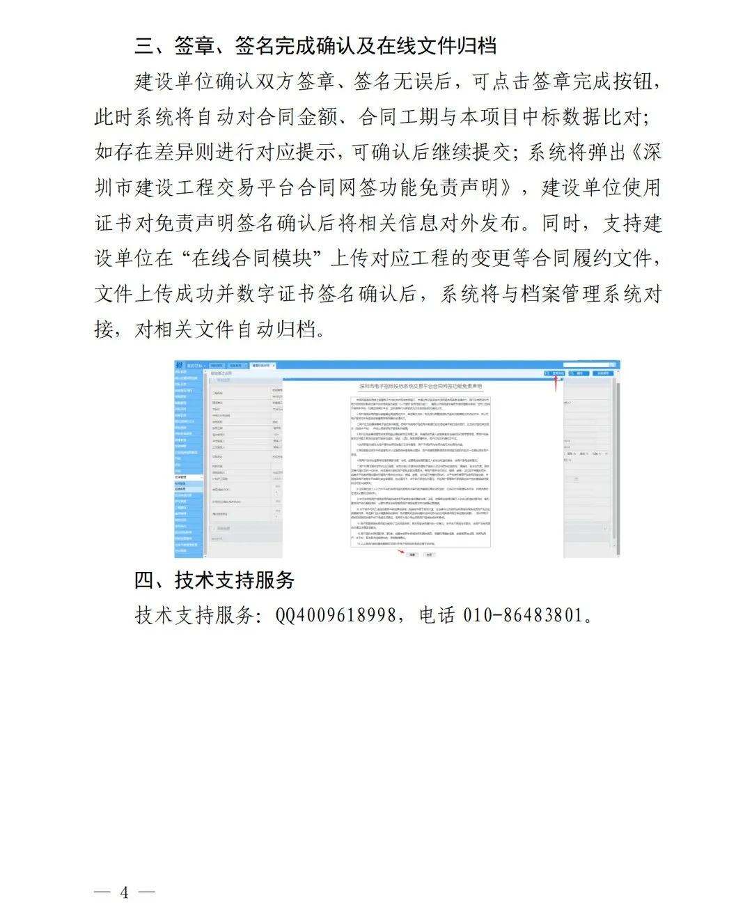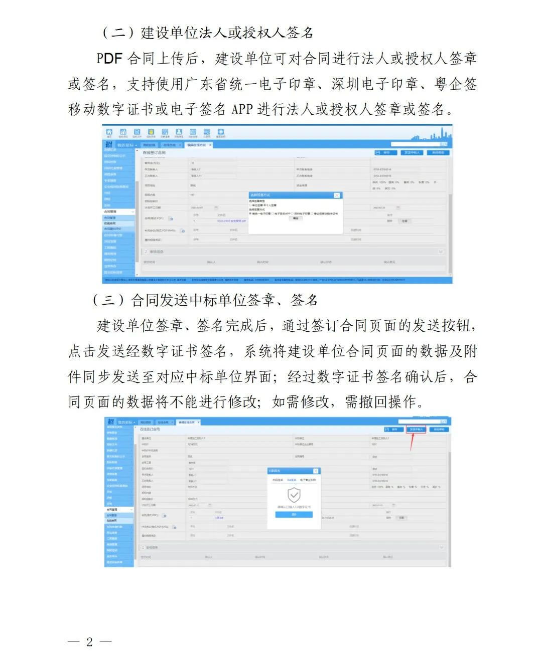 合同網簽參照現行紙質合同簽訂方式,由合同雙方對擬定合同進行單位電子簽章(公章)和法人(授權人)電子簽名。合同雙方可根據實際情況,參照《深圳市建設工程合同網簽電子簽名印章辦理指南》(詳見附件1)選擇辦理合同網簽所需電子簽名簽章。招標建設工程在確定中標人后,按照《深圳市建設工程交易平臺網簽操作指引》(詳見附件2)進行合同網簽,并即時上傳歸檔合同履行中相關文件資料。