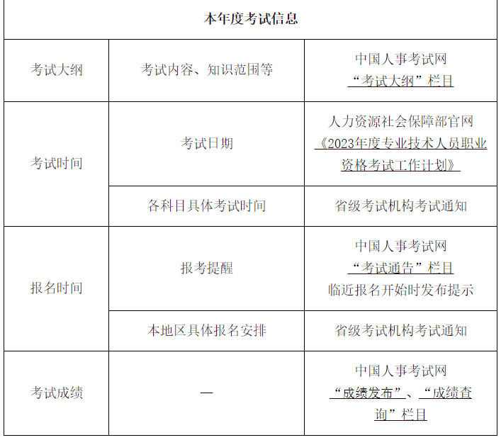 為方便廣大考生查詢考試信息,根據《人力資源社會保障部辦公廳關于2023年度專業技術人員職業資格考試計劃及有關事項的通知》(人社廳發〔2023〕3號)有關安排及各項考試制度規定,現將有關事項通告如下: